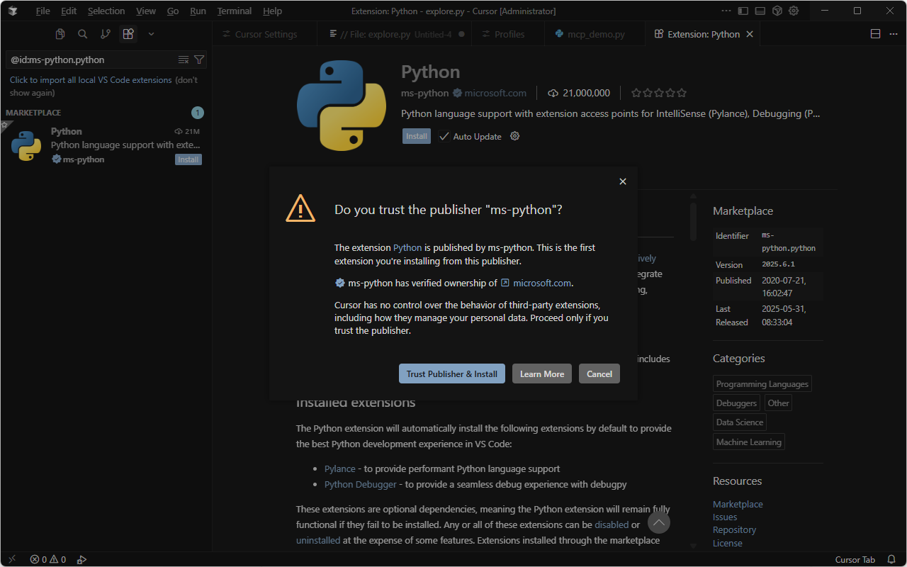 安装完成后,验证环境是否生效,确保Cursor能正常调用Python解释器。