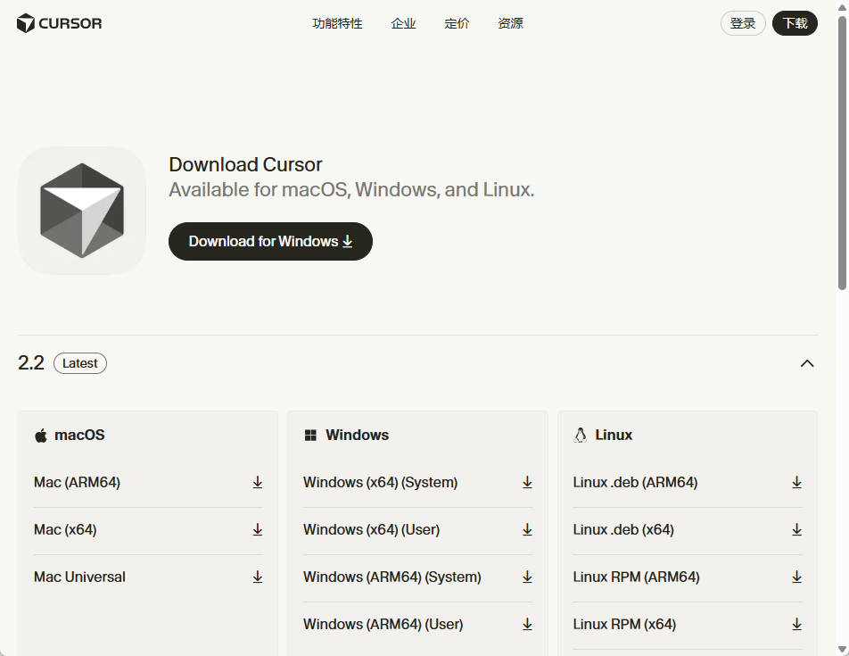1.下载Cursor:https://cursor.com/cn/download