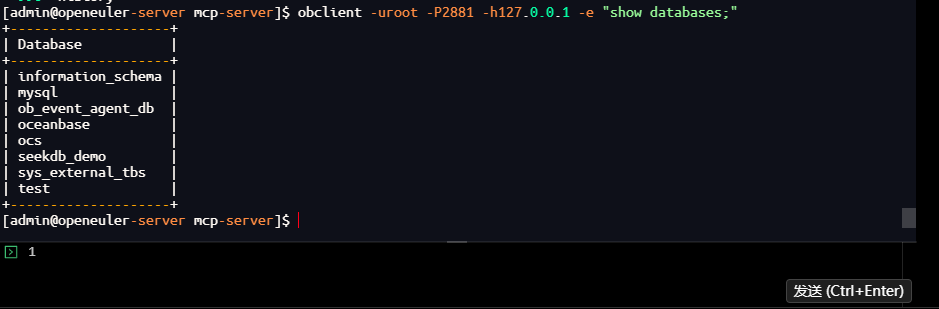 [admin@openeuler-server mcp-server]$ obclient -uroot -P2881 -h127.0.0.1 -e "show databases;"