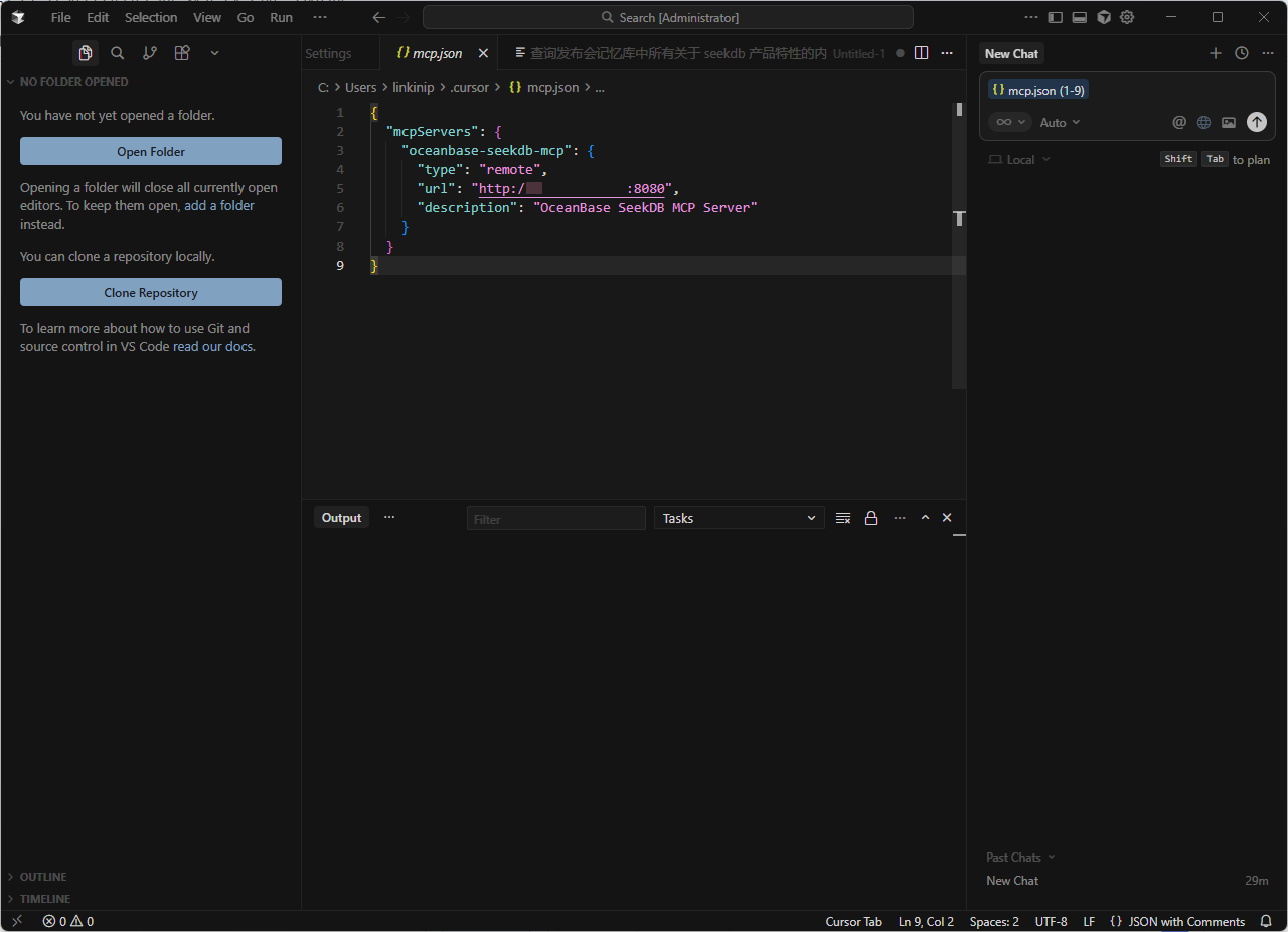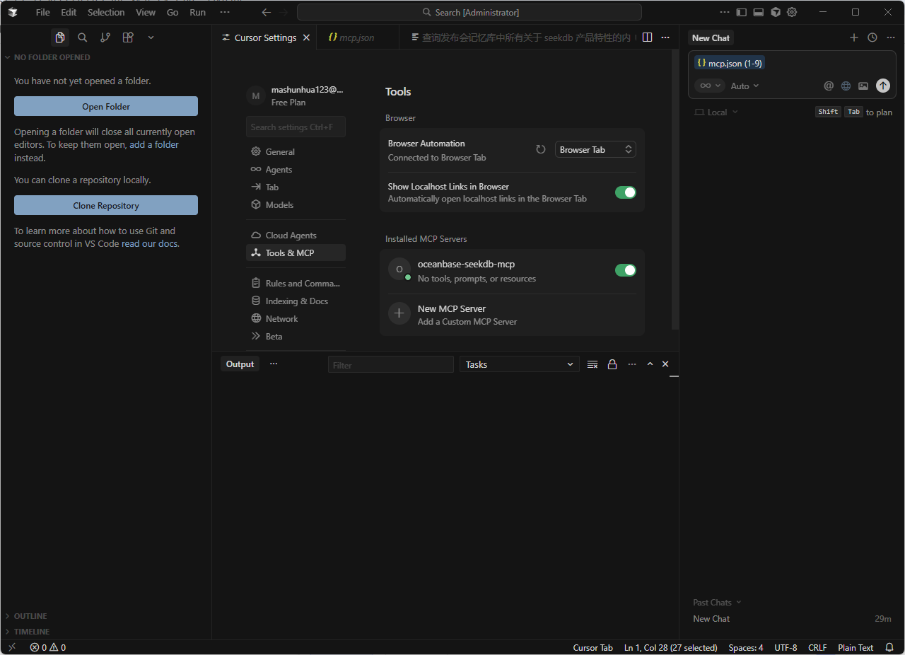 MCP是连接Cursor Agent与SeekDB的核心组件,负责将AI生成的指令转换为数据库可执行的操作。以下是完整部署步骤: