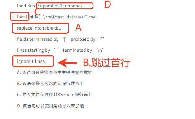 关于在 MySQL 模式下使用如下 LOAD DATA 语句导入数据的解释正确的是:【单