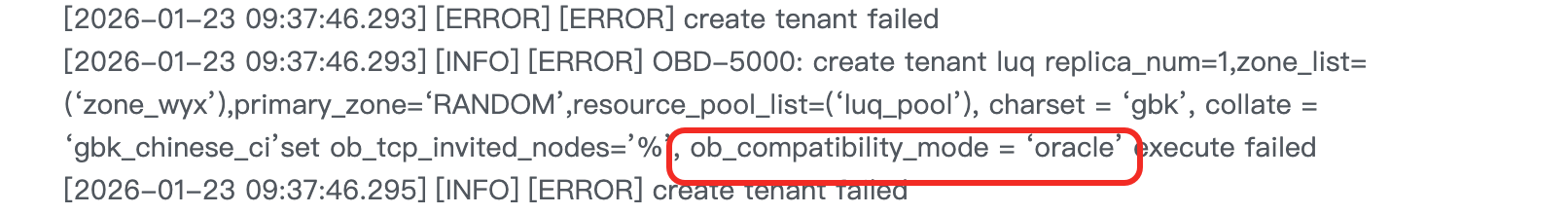 [2026-01-23 09:37:46.293] [ERROR] [ERROR] OBD-5000: create tenant luq replica_num=1,zone_list=(‘zone_wyx’),primary_zone=‘RANDOM’,resource_pool_list=(‘luq_pool’), charset = ‘gbk’, collate = ‘gbk_chinese_ci’set ob_tcp_invited_nodes=’%’, ob_compatibility_mode = ‘oracle’ execute failed