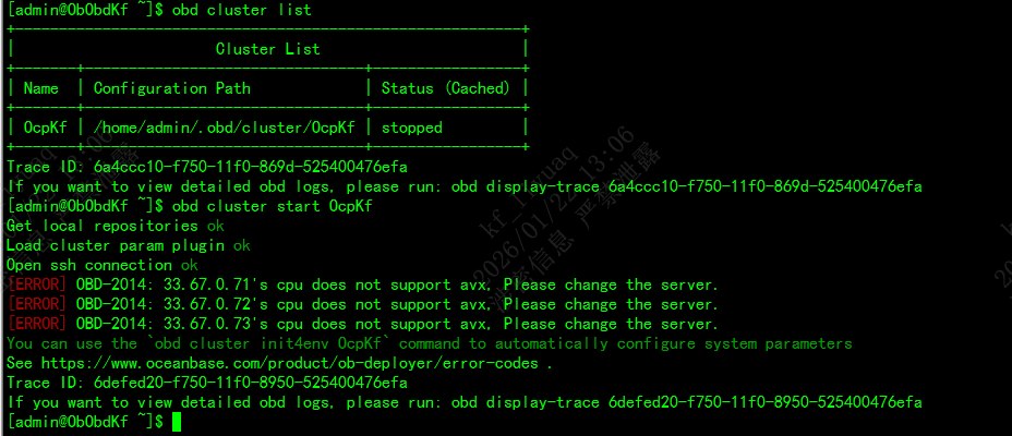 【问题描述】obd 无法启动已安装的OCP集群,报错[ERROR] OBD-2014: 33.67.0.73’s cpu does not support avx, Please change the server.