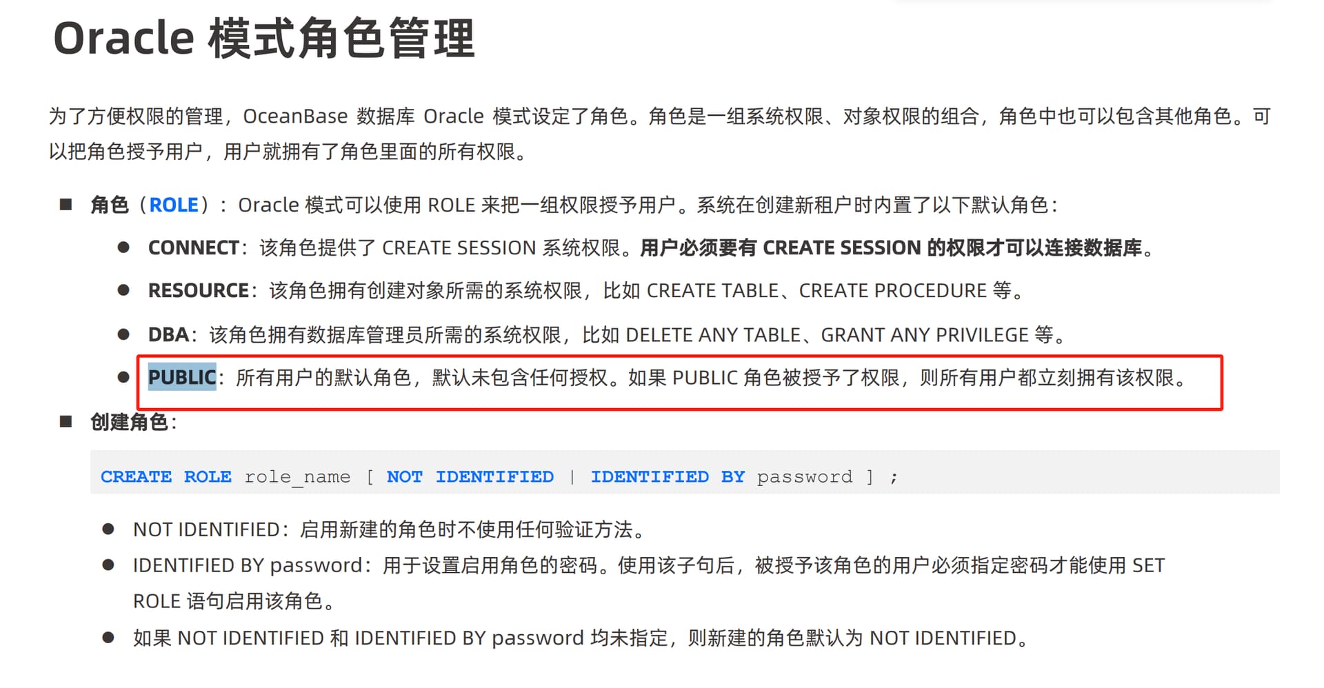 在 OceanBase 中,PUBLIC 角色适用于整个租户内的用户,但默认未授予权限。这与 Oracle 的行为类似,即 PUBLIC 本身不包含权限,而是通过显式授权来赋予用户权限。