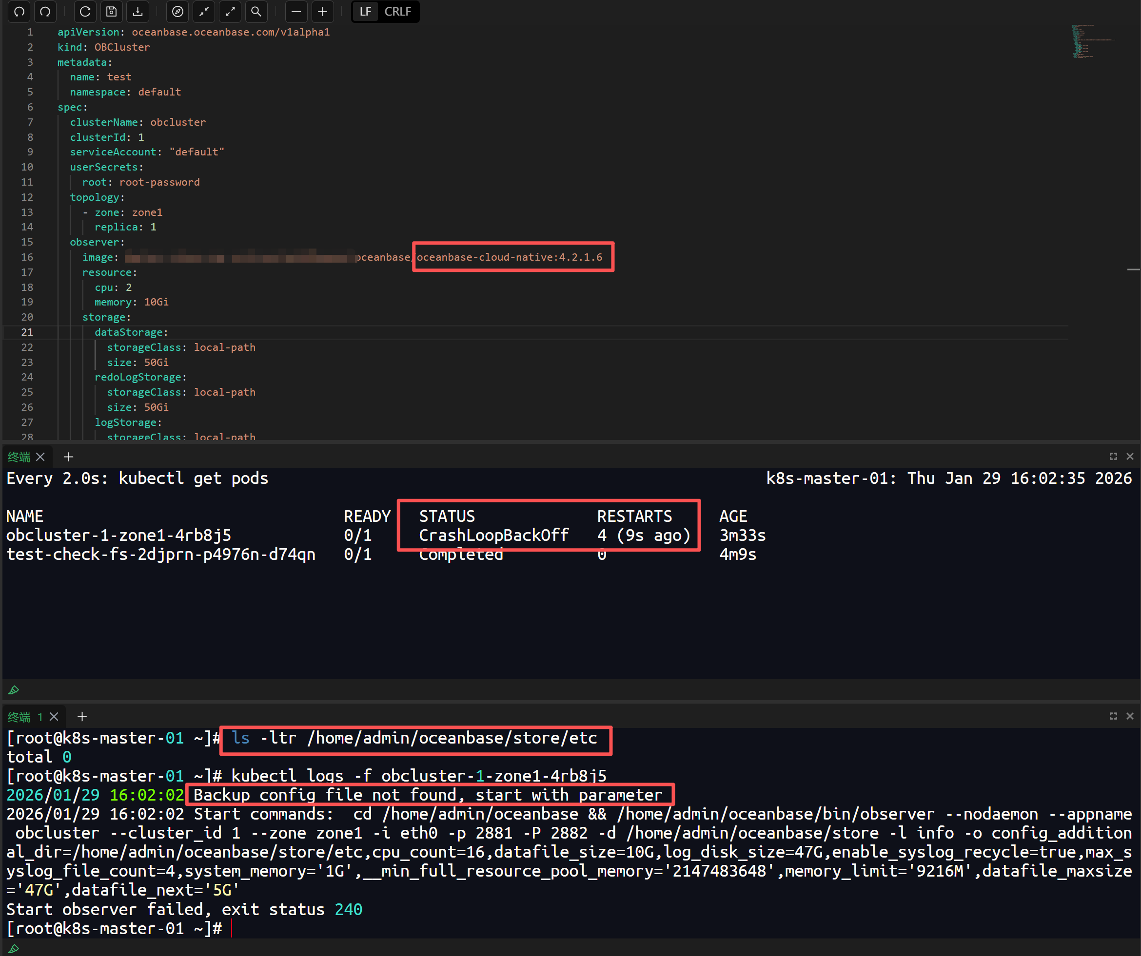 【问题描述】ob-operator已安装,使用kubectl apply -f https://raw.githubusercontent.com/oceanbase/ob-operator/stable/example/quickstart/obcluster.yaml创建集群后,obcluster pod总是重启。查询是因为没有找到配置文件所以报错,但官方文件中并没有配置文件加载的方法。