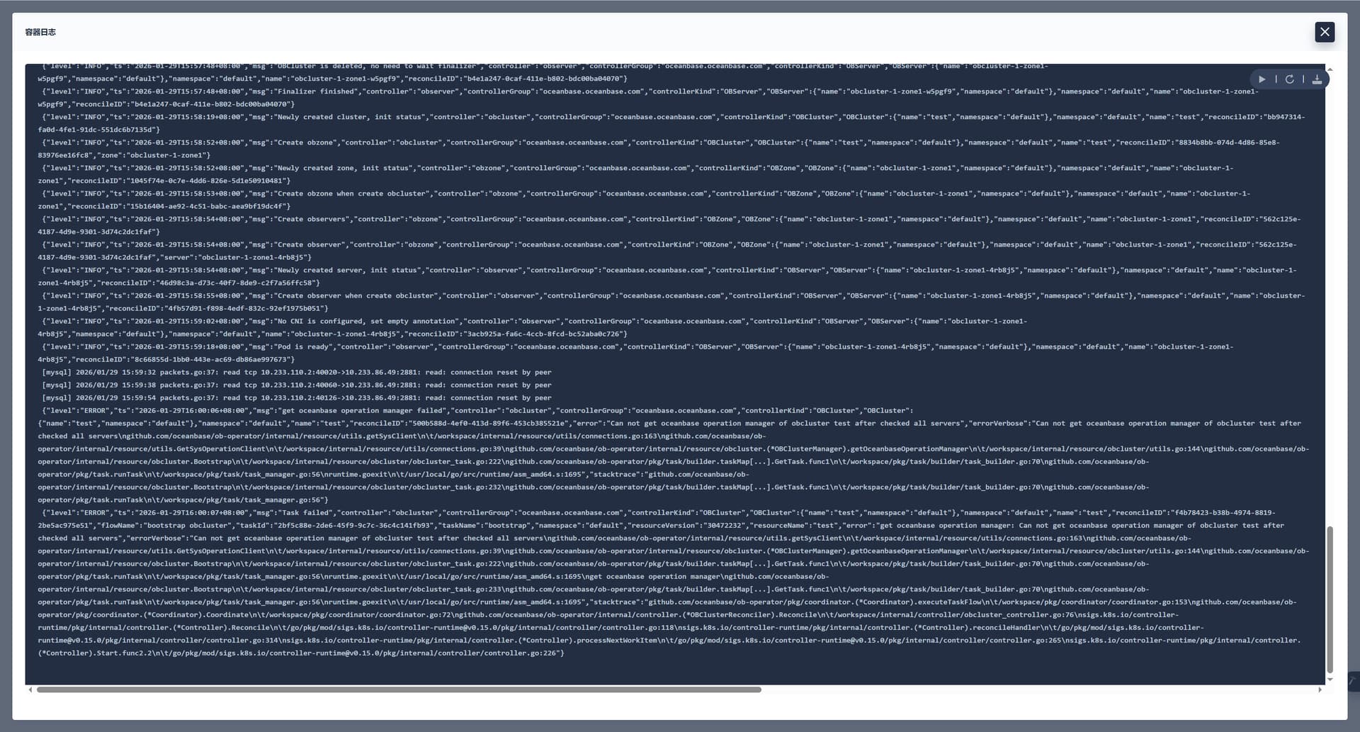 您好,大佬。您是说ob-operator这个容器嘛,这是最新的报错日志,麻烦看下: