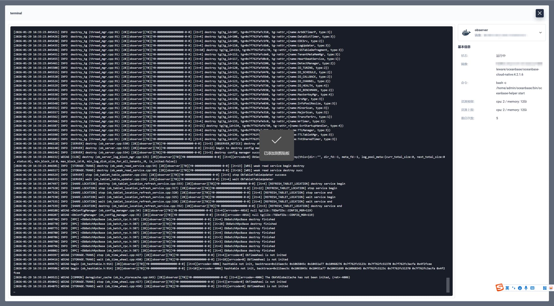 2026/01/27 18:24:26 Start commands: cd /home/admin/oceanbase && /home/admin/oceanbase/bin/observer --nodaemon --appname obcluster --cluster_id 1 --zone zone1 -i eth0 -p 2881 -P 2882 -d /home/admin/oceanbase/store -l info -o config_additional_dir=/home/admin/oceanbase/store/etc,cpu_count=16,datafile_size=10G,log_disk_size=47G,enable_syslog_recycle=true,max_syslog_file_count=4,memory_limit=‘9216M’,datafile_maxsize=‘47G’,datafile_next=‘5G’,system_memory=‘1G’,__min_full_resource_pool_memory=‘2147483648’