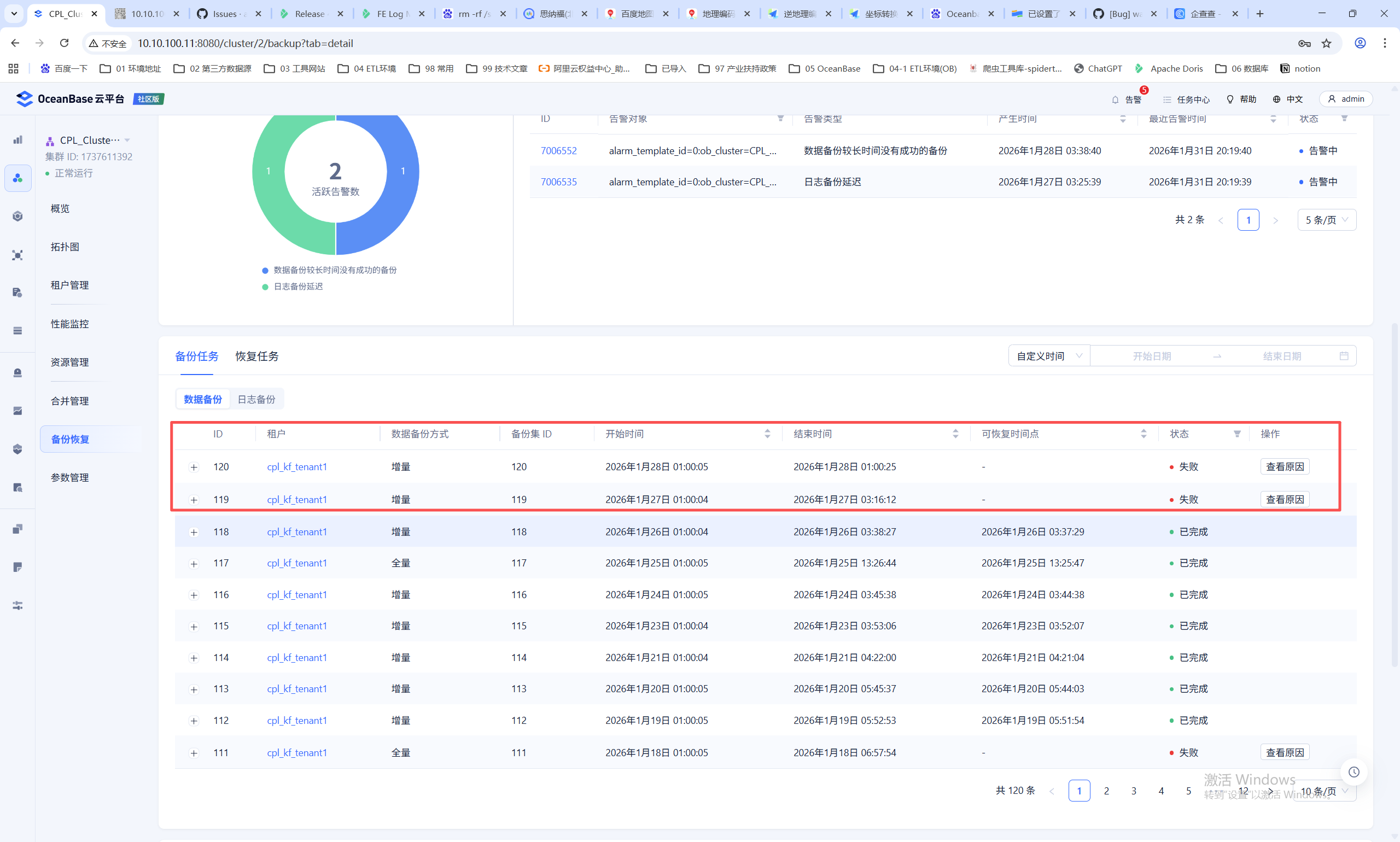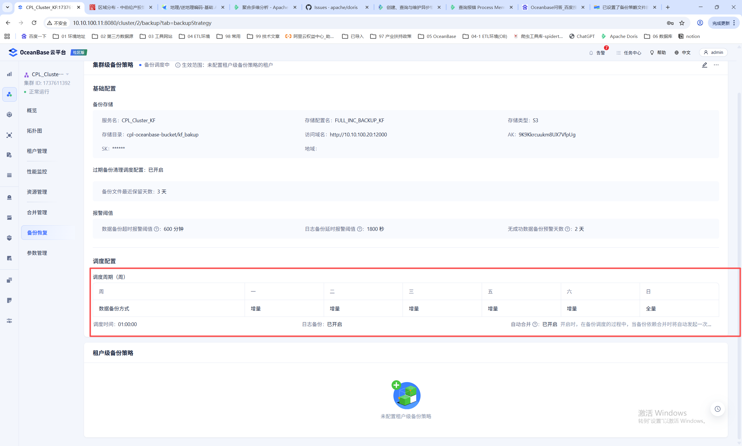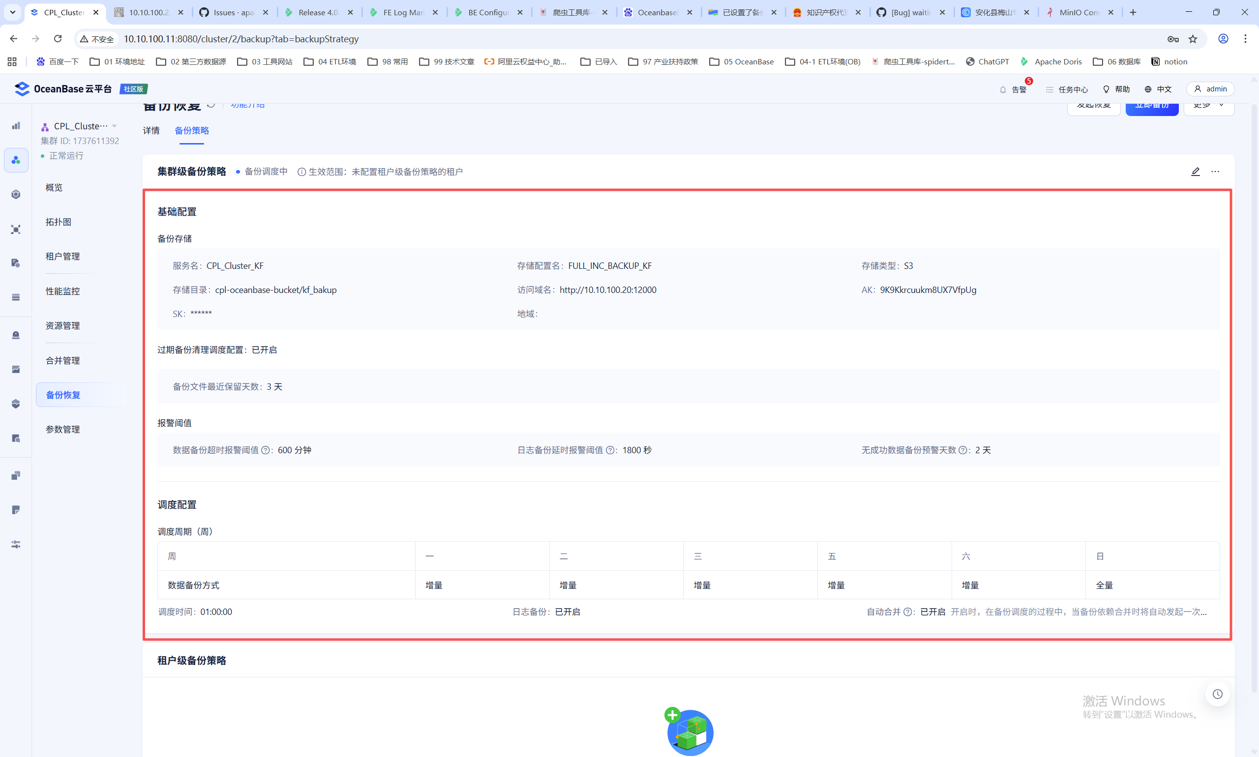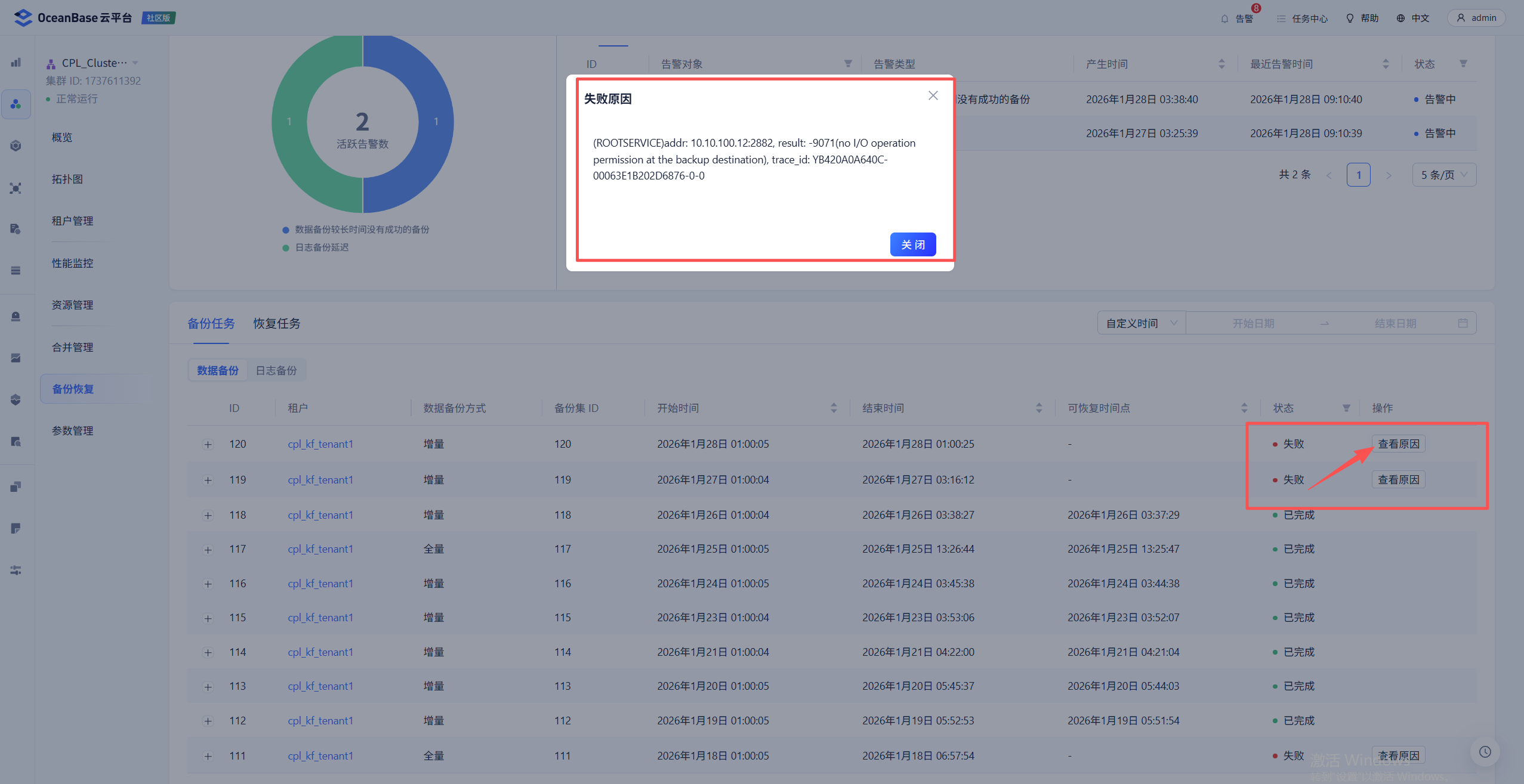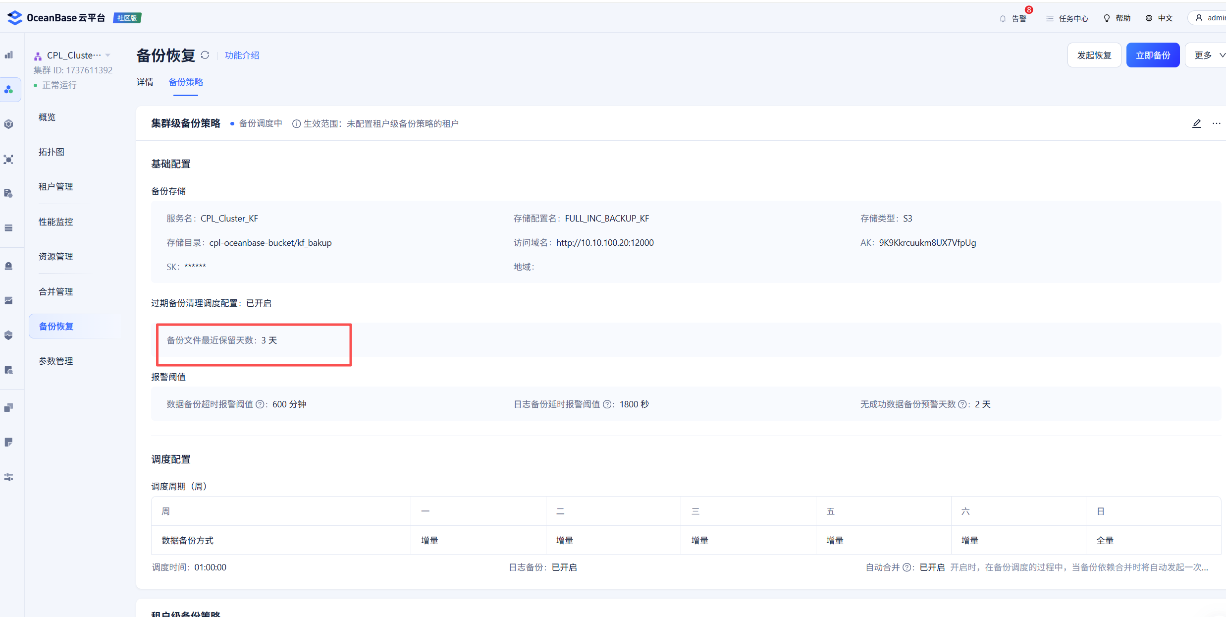 我的备份策略中一直设置有备份文件保留时间,之前的值为7天,但是从监控和磁盘占用看,备份文件空间大小一直在曾展,导致目前OB的备份失败,我有两个问题需要求教: