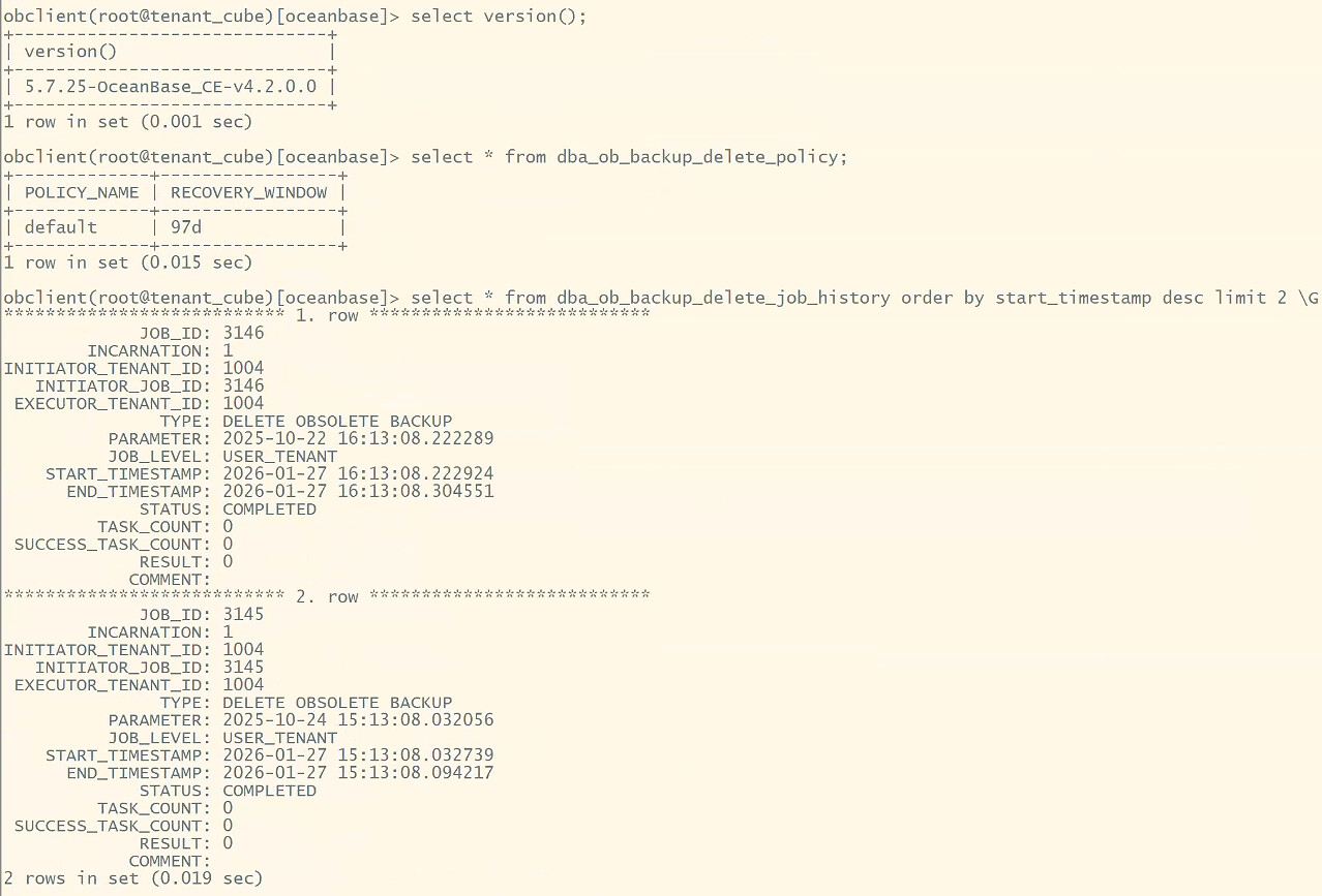 【问题描述】在 2025.10.21 有个备份,一直没有删除.当前的 recovery_window 是 1d, data_backup_dest 与 10.21 的备份目录是相同的, 我把 recovery windows 放大到 97d, 1 小时后它仍然没有删除, dba_ob_backup_delete_job_history 查看任务是执行完成的, 如何清理这个备份及其对应的 archivelog ?