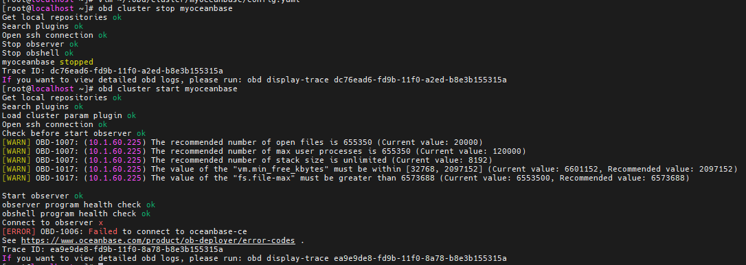 【问题描述】oceanbase-all-in-one白屏安装,执行obd demo报错