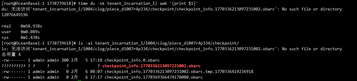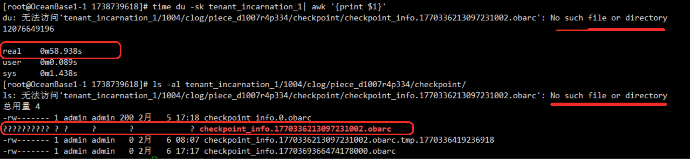 ocp_agent(observer机器)30秒执行一次 du -sk <备份路径> | awk ‘{print $1}’ 来计算NFS上的备份文件大小,循环了 10080秒(3小时)未计算出结果,超时,首先怀疑存储性能有问题