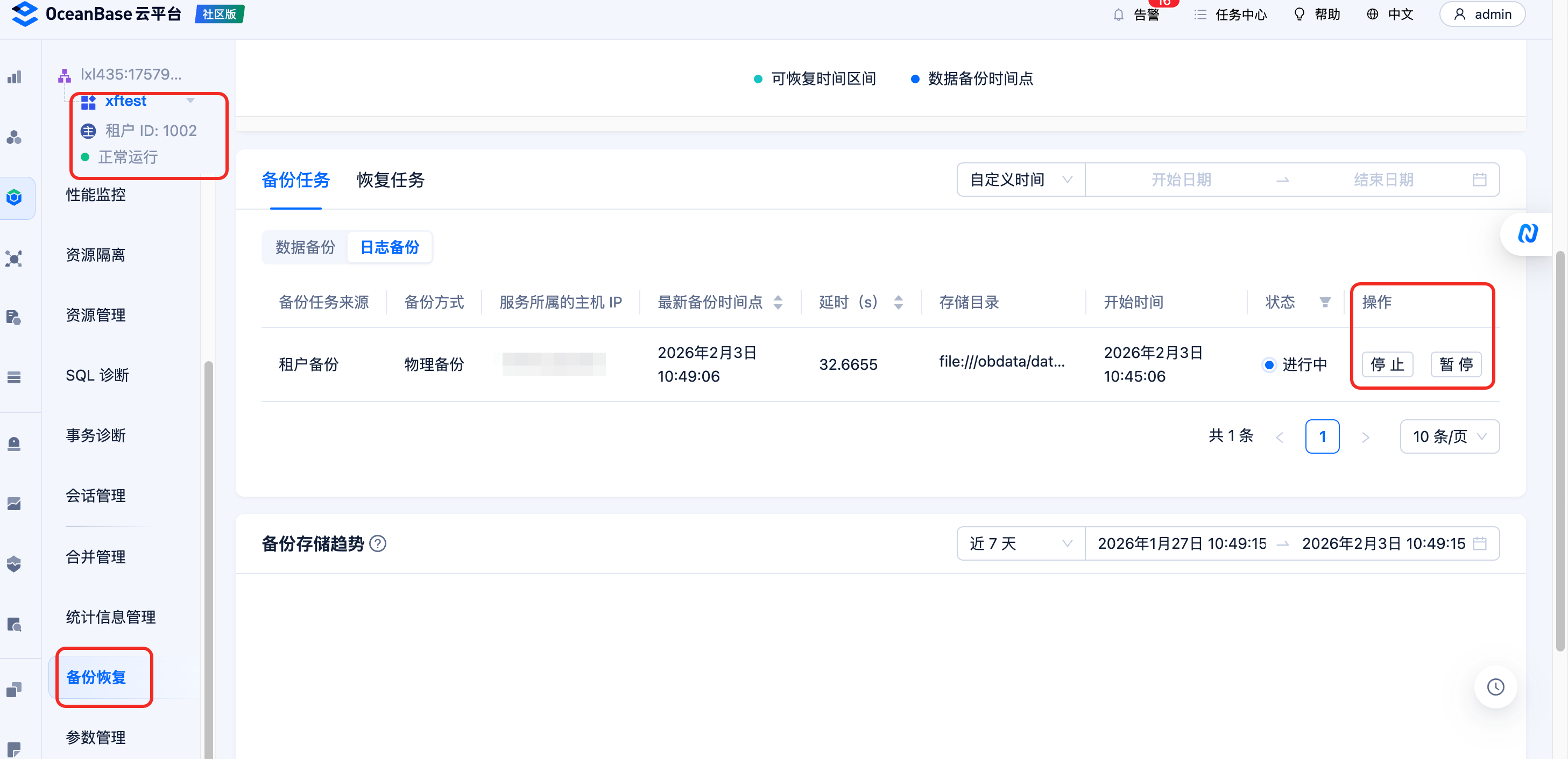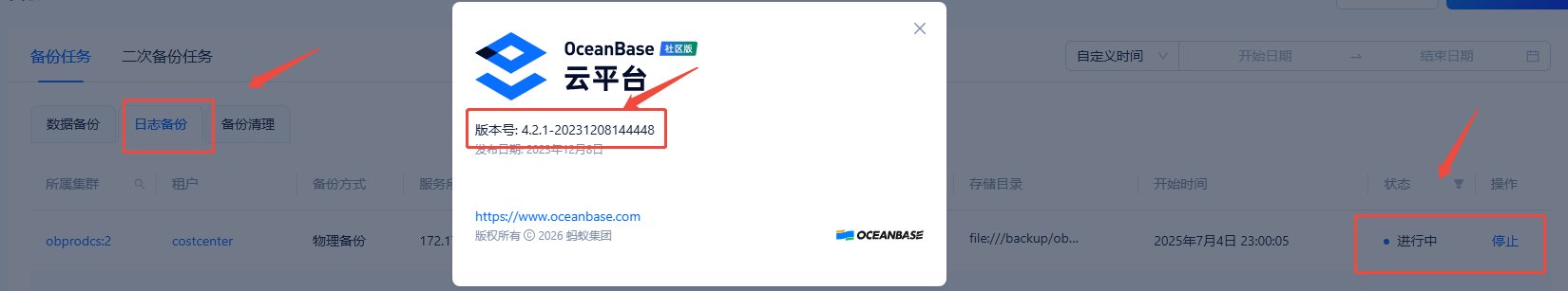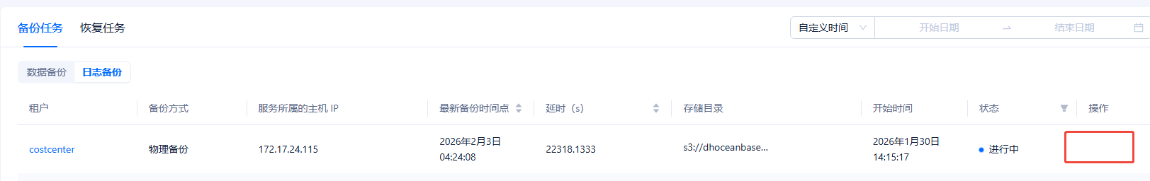 【问题描述】2026年1月30日 14:15:50对单个租户通过ocp进行了立即备份操作,备份介质为minio最新社区版,数据备份5分钟52秒后显示已完成,备份路径s3://dhoceanbase/dh_oceanbase/1763020282/tenant_incarnation_1/1006/data,数据备份目录大小15g,但是日志备份已经运行了3天仍显示进行中,备份路径s3://dhoceanbase/dh_oceanbase/1763020282/tenant_incarnation_1/1006/clog,经检查minio上clog下生成了piece_d1001r1p1~p3系列目录,占用空间大小都是50g左右.请问如何能手工停止这个日志备份?