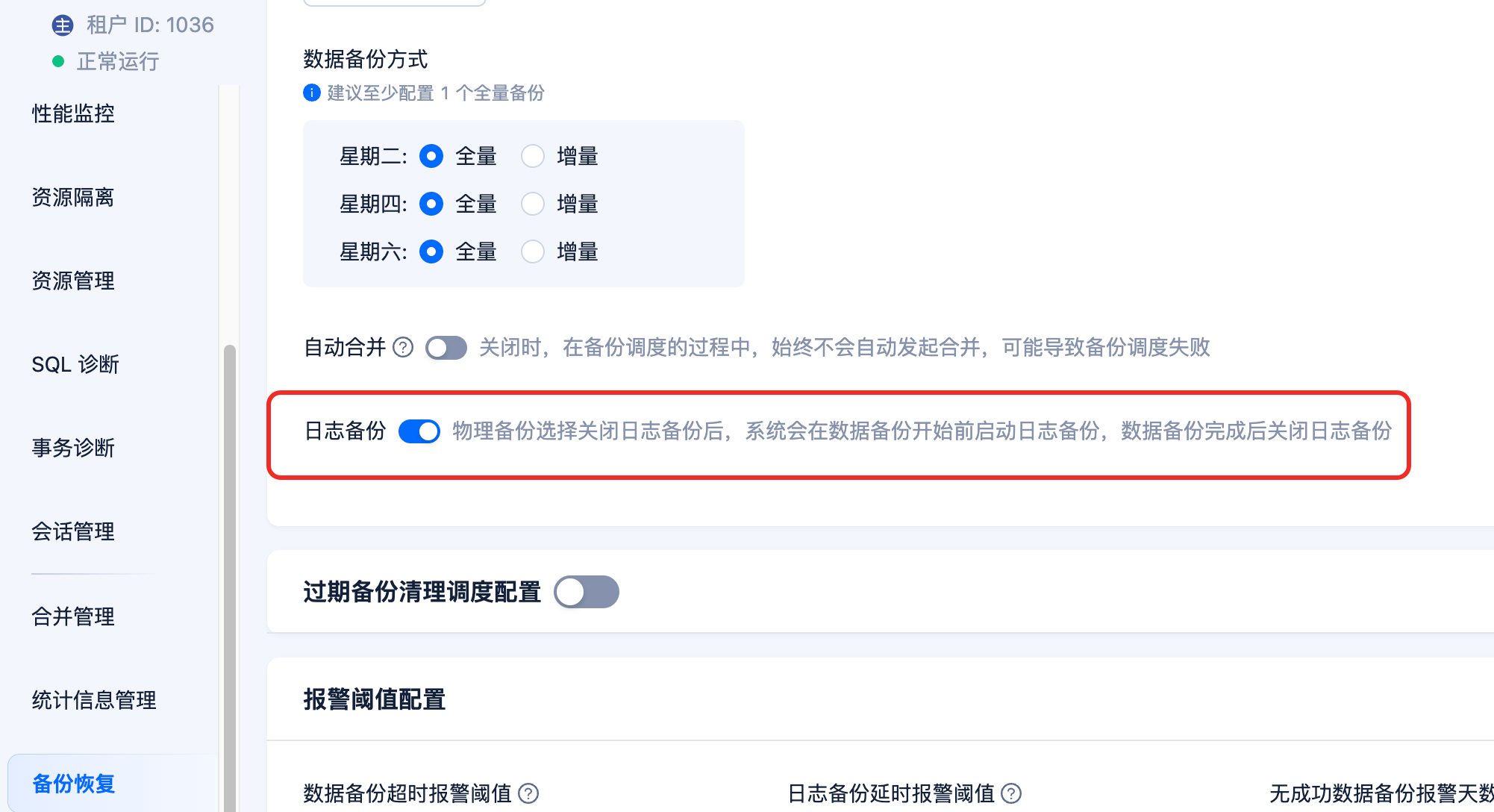 和是否社区版没有关系,就是数据库要做热备份 需要开启归档,这里的日志备份就是日志在做归档的意思,防止事物日志中断而无法基于备份和日志做PITR恢复,和其它数据库表现是一样的