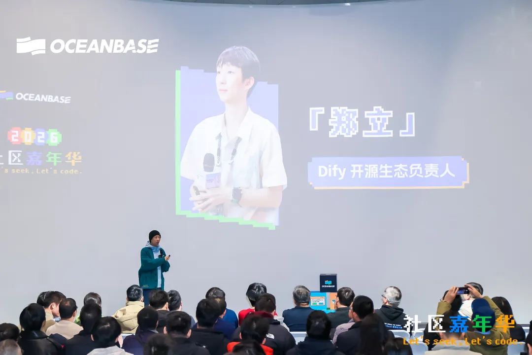 Dify 开源生态负责人郑立以“Dify x OceanBase seekdb”为主题,进行了分享。他通过具体实践案例,介绍了 Dify 的核心能力,以及在与 OceanBase seekdb 的合作中打造一体化数据库的实践路径。