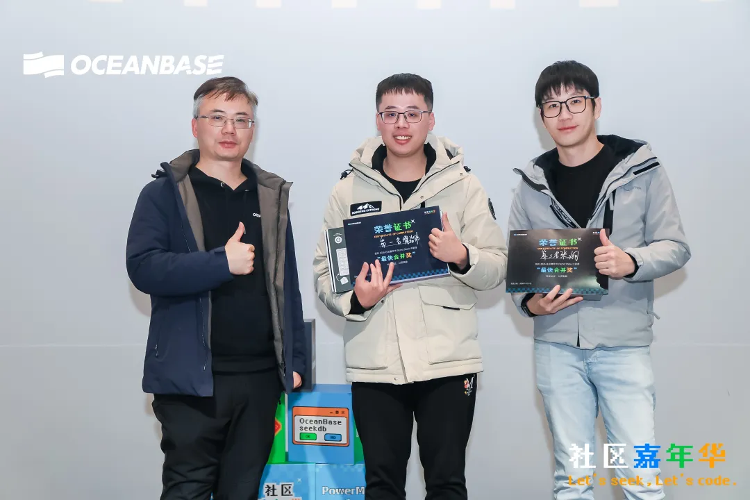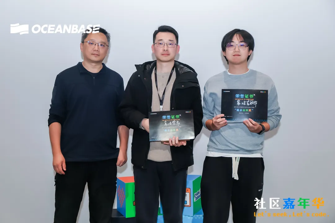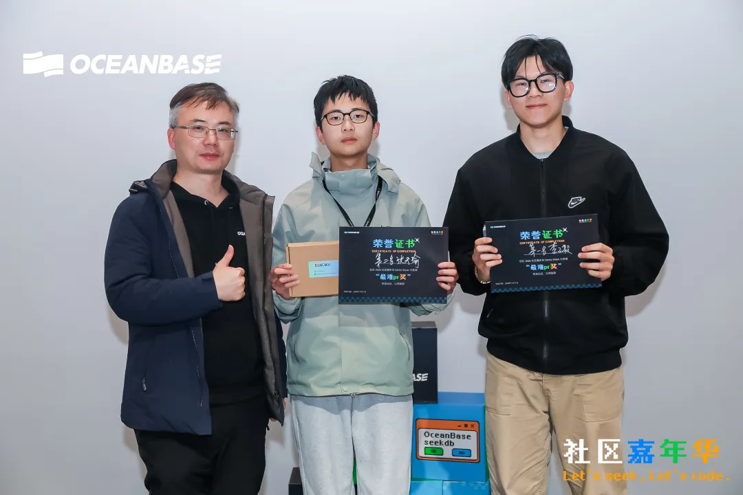 在 AI Coding 环节,颁发了“最快合并奖”“最难 pr 奖”“最多合并奖”“最佳创意奖”等 10 项大奖,其中,OceanBase Ambassador 程治玮获“最佳创意奖”,来自上海的 13 岁初二少年张天瑜获得 AI Coding “最难 pr 奖”第二名。