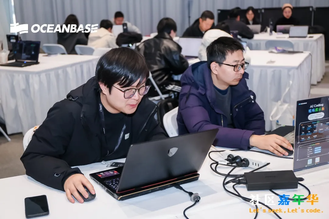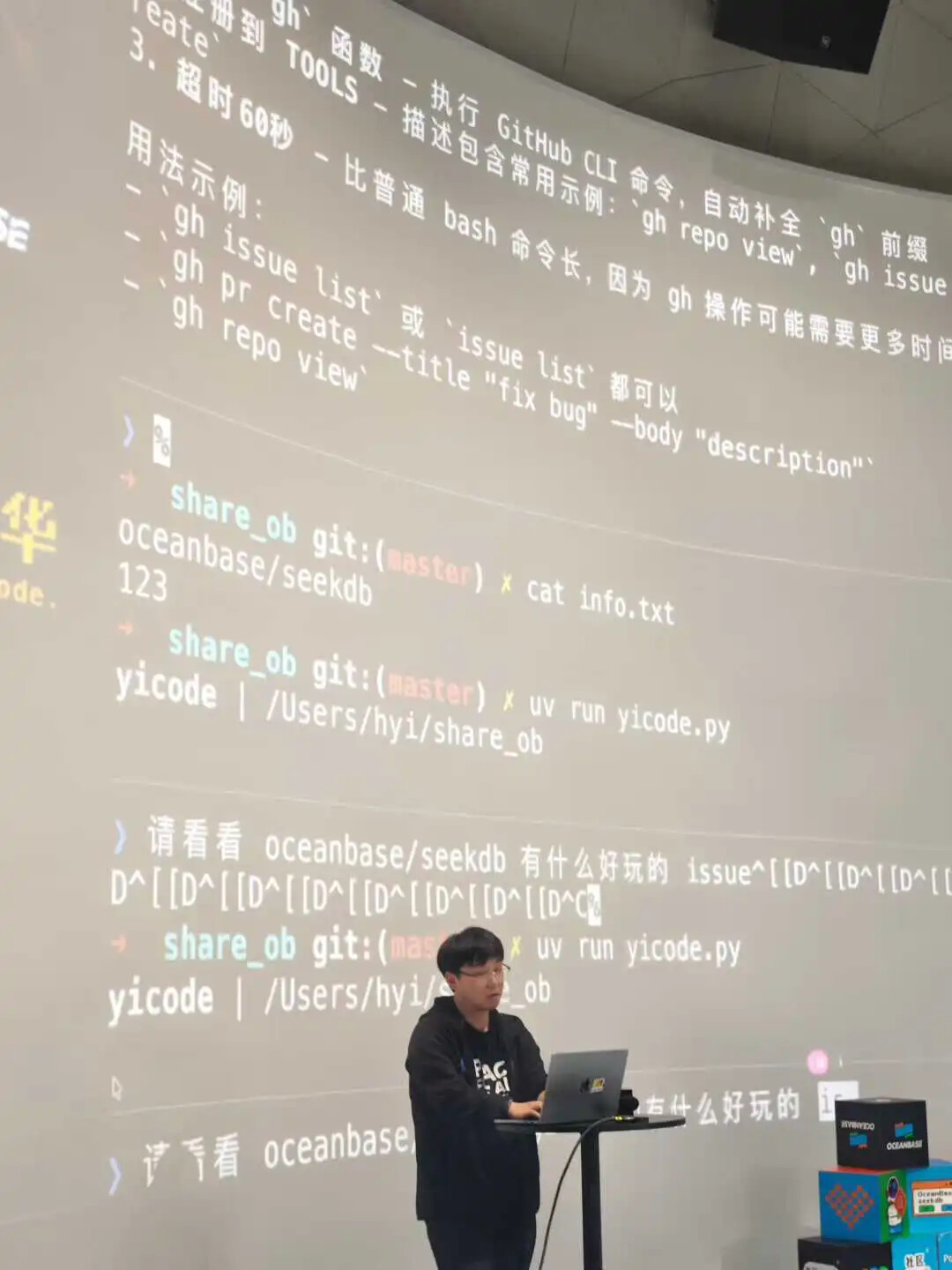 此外,本次活动创新设立了 AI Coding 实战环节。OceanBase Ambassador 伊洪以“开源,Agents 以及 AI Coding”为主题,进行了分享,并在现场零代码“手搓” coding agent 。