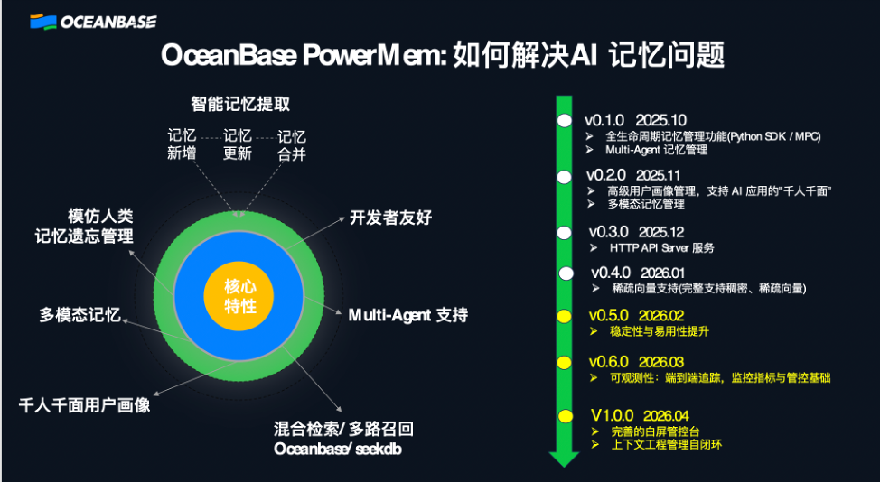 AI 应用想真正“好用”,必须解决“记忆”问题——它得记得你是谁、说过什么、偏好什么,还要能在合适的时候把这些信息准确地拿出来用。OceanBase PowerMem就是为这个目标而生的智能记忆系统。它不是简单把聊天记录存起来,而是把对话里真正有价值的信息“提炼成记忆”:该新增就新增、冲突就更新、重复就合并,让记忆库始终准确、干净、可用。同时我们引入了认知科学里的艾宾浩斯遗忘曲线,让系统像人一样对信息做时间衰减和权重管理——重要的记得更久,不重要的自然淡出,避免“越用越乱”。