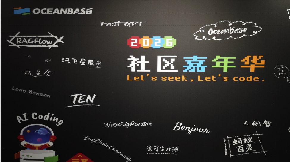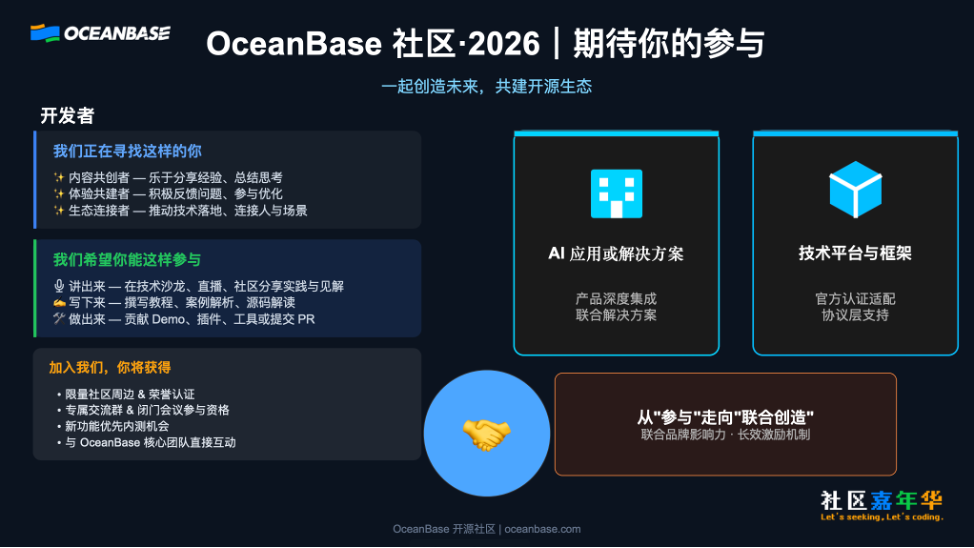 回到社区,我们在2026年将会主动与更多技术社区互动,定期邀请开发者走进OceanBase。