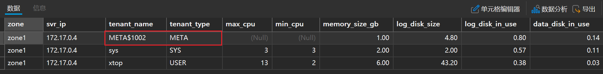 select a.zone,a.svr_ip,b.tenant_name,b.tenant_type, a.max_cpu, a.min_cpu,