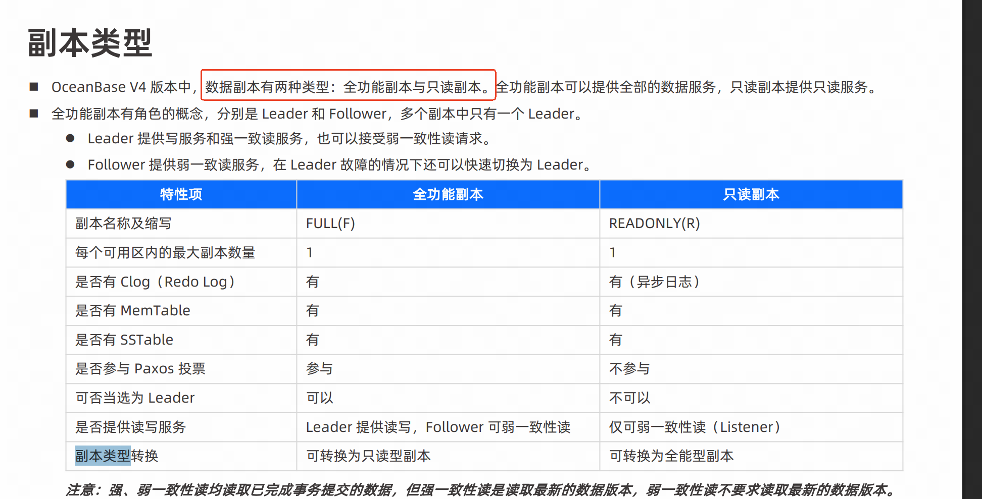 B. 全功能型副本既可读也可写,只读型副本只能读,两种副本均支持强一致性读操作。