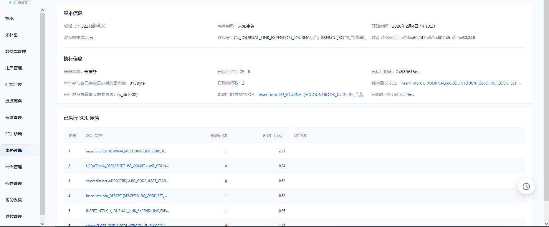 SESSION_ID 使用连接工具连接到OBsever节点 kill SESSION_ID 后该 SESSION_ID没有了 会出现新的长事务新的 SESSION_ID
