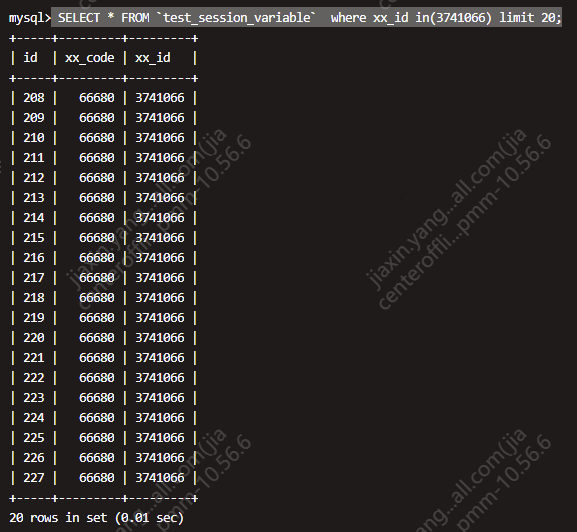 SELECT * FROM `test_session_variable` where xx_id in(3741066) limit 20;