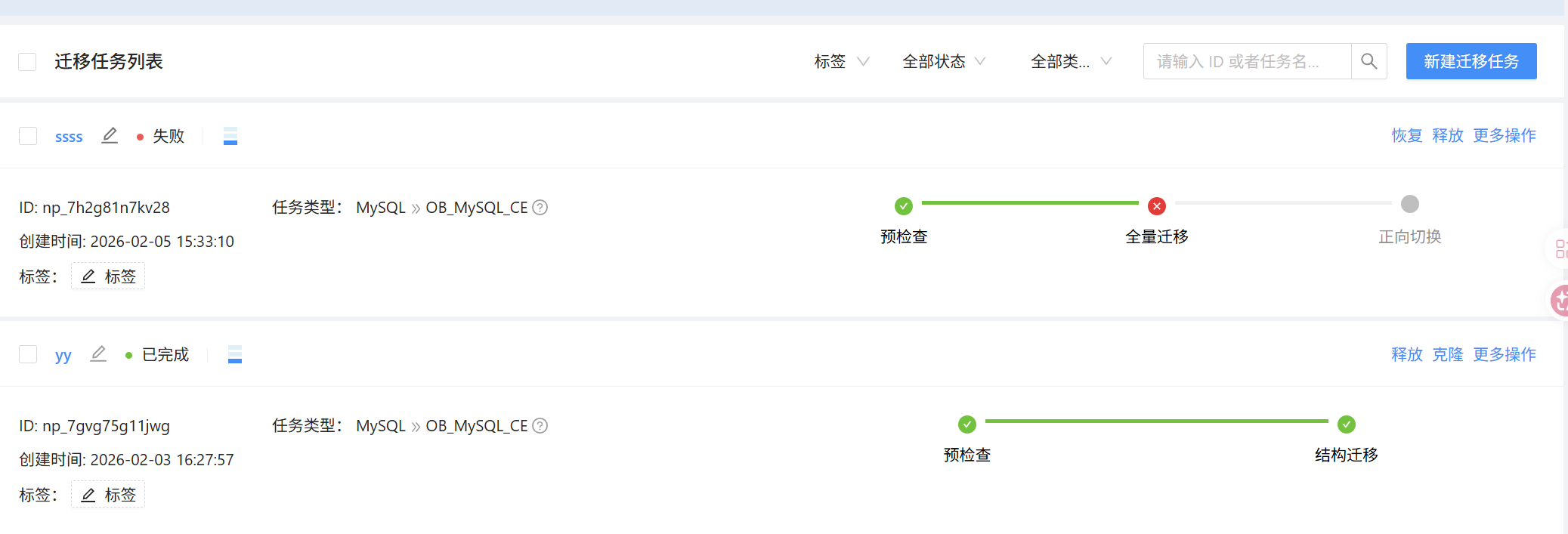 【问题描述】测试迁移三个表, 只迁移数据结构时没问题, 新建了一个任务全量迁移时报错如下