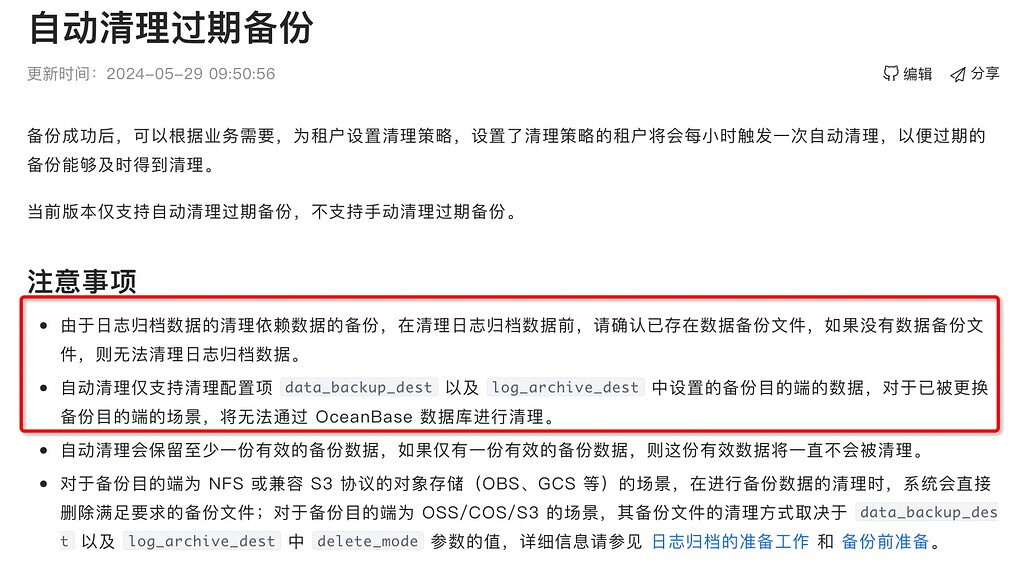 您好!关于租户开启 NFS 归档模式后归档日志的清理方法,目前提供的文档片段并没有直接提到相关的具体操作步骤。但是,通常情况下,归档日志的清理涉及以下几个方面: