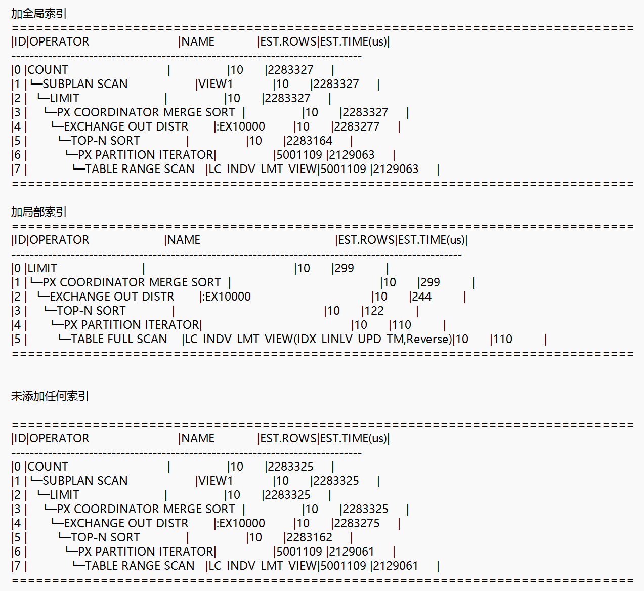 【问题描述】有张表table,按照cust_01(用户编号)分了7个区(Hash),现在需要分页查询然后order by DT_01 desc降序排列。我们现在使用CREATE INDEX IDX_INLV_DT_01 ON table(DT_01) GLOBAL创建了全局索引,但是看执行计划似乎没有走索引。然后我创建了一个局部索引,同样的sql语句就可以走索引查询。