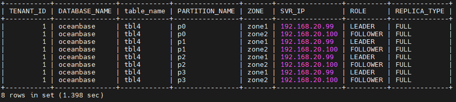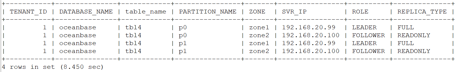 locality = "FULL{1}@zone1, FULL{1}@zone2",并新建了分区表tbl4(2 个分区 p0/p1)。但查询表分区位置发现:所有分区的 Leader 均固定在 zone1(192.168.20.99),zone2(192.168.20.100)仅为 READONLY Follower,未出现 Leader 分布在 zone2 的情况,不符合预期。