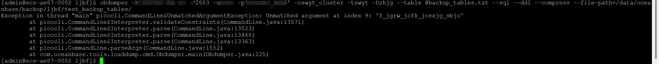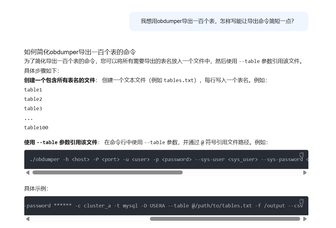 在oceanbase的实际使用场景中,遇到了要通过obdumper只导出库里其中一部分表的情况,表的数量比较多,直接写在obdumper的命令行中不太现实也不好维护,询问AI说是可以将表名全部写入文件,再在obdumper中引用该文件的路径,实现导出文件中的表,但是实际测试下来发现一直会报错,查看官方文档也并未提到这种方式,请问这种方式是可行的吗,这种报错应该怎么解决?