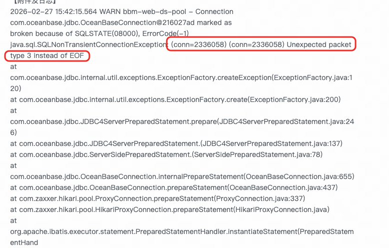 2026-02-27 15:42:15.564 WARN bbm-web-ds-pool - Connection com.oceanbase.jdbc.OceanBaseConnection@216027ad marked as