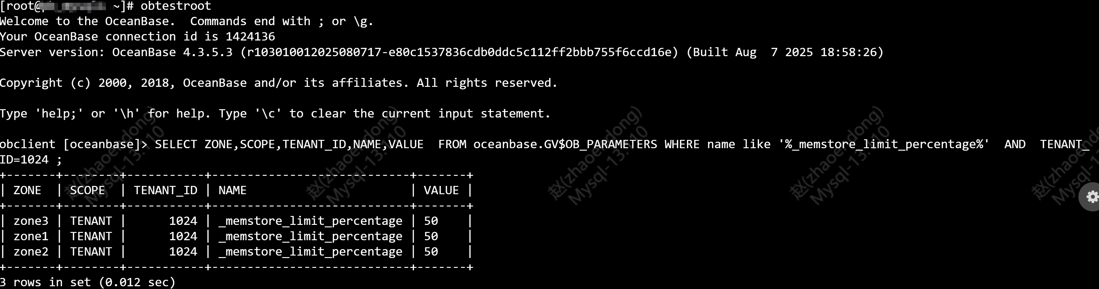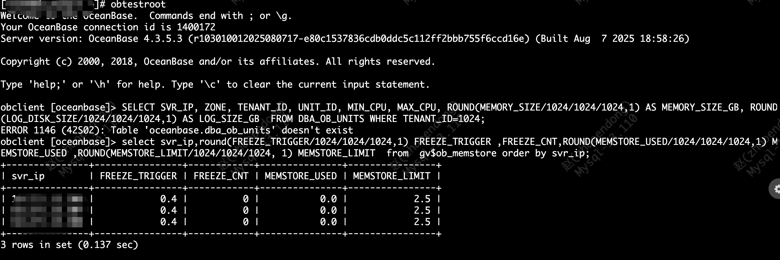 4 登录test租户查询GV$ob_memestore
