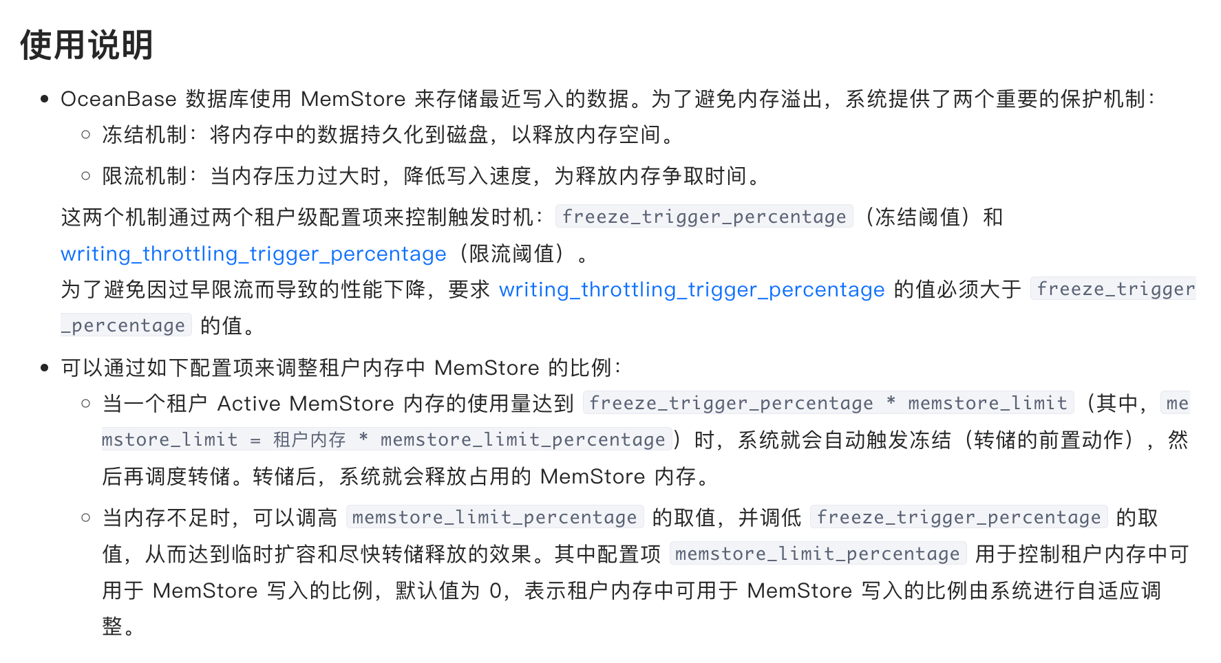 【问题描述】当前有一个租户的配置1.5c6GB配置,正常情况下租户参数memstore_limit_percentage=50,freeze_trigger_percentage=20,由于我租户内存为6GB ,那么我的