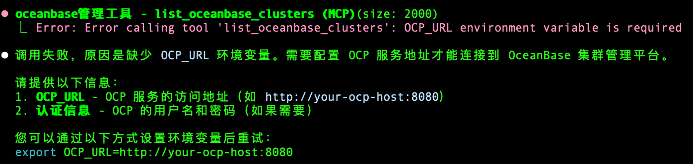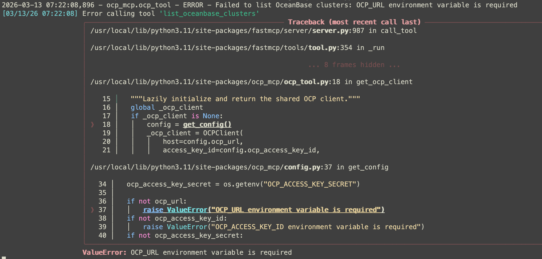 【问题描述】按照文档https://github.com/oceanbase/awesome-oceanbase-mcp/tree/main/src/ocp_mcp_server部署ocp mcp server时报错