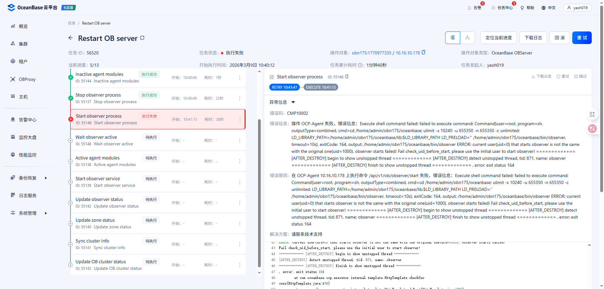 你ob使用的哪个用户部署的。