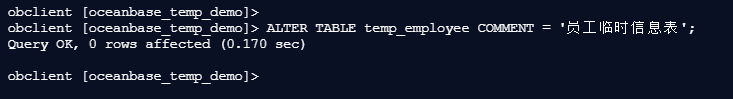 obclient [oceanbase_temp_demo]> ALTER TABLE temp_employee COMMENT = '员工临时信息表';