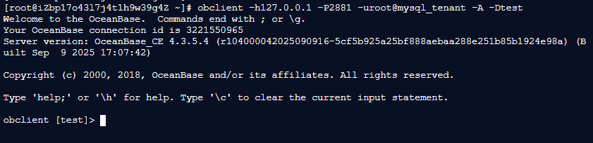 [root@iZbp17o43l7j4t1h9w39g4Z ~]# obclient -h127.0.0.1 -P2881 -uroot@mysql_tenant -A -Dtest