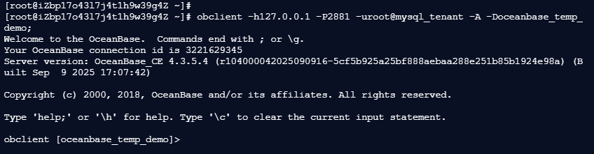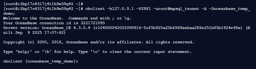 [root@iZbp17o43l7j4t1h9w39g4Z ~]# obclient -h127.0.0.1 -P2881 -uroot@mysql_tenant -A -Doceanbase_temp_demo;