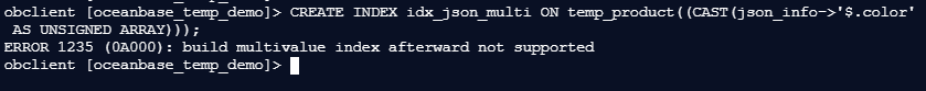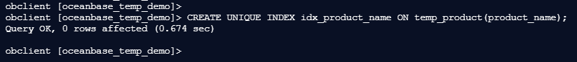 obclient [oceanbase_temp_demo]> CREATE UNIQUE INDEX idx_product_name ON temp_product(product_name);