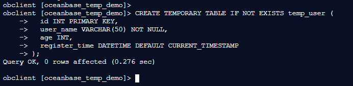 obclient [oceanbase_temp_demo]> CREATE TEMPORARY TABLE IF NOT EXISTS temp_user (
