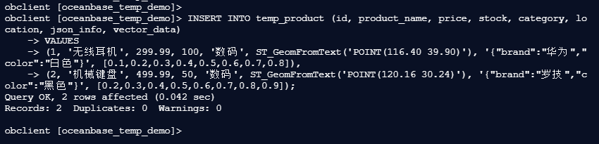 obclient [oceanbase_temp_demo]> INSERT INTO temp_product (id, product_name, price, stock, category, location, json_info, vector_data)