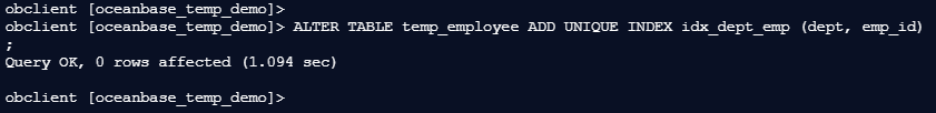 obclient [oceanbase_temp_demo]> ALTER TABLE temp_employee ADD UNIQUE INDEX idx_dept_emp (dept, emp_id);