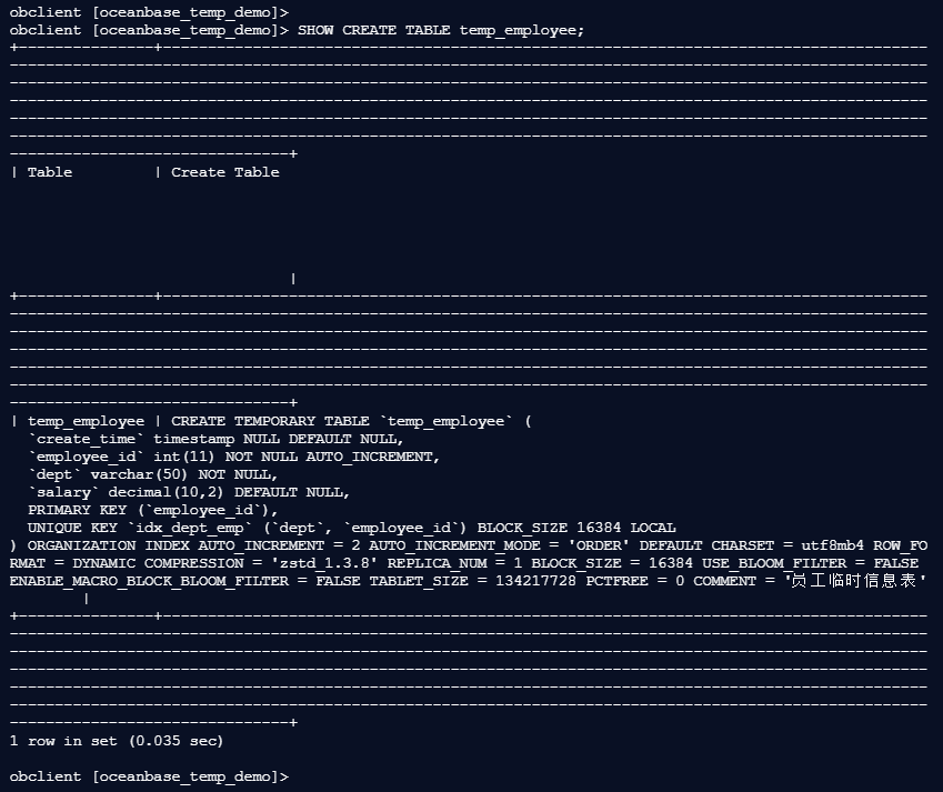 obclient [oceanbase_temp_demo]> CREATE TEMPORARY TABLE temp_employee (