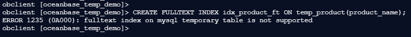 obclient [oceanbase_temp_demo]> CREATE TEMPORARY TABLE temp_product (