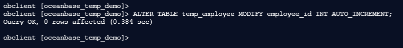 obclient [oceanbase_temp_demo]> ALTER TABLE temp_employee MODIFY employee_id INT AUTO_INCREMENT;