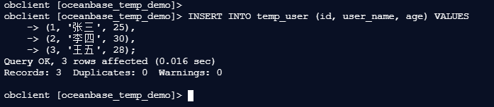 obclient [oceanbase_temp_demo]> INSERT INTO temp_user (id, user_name, age) VALUES