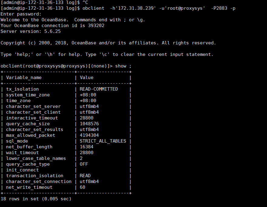 在ocp 机器上使用obclient 连接 obproxy: