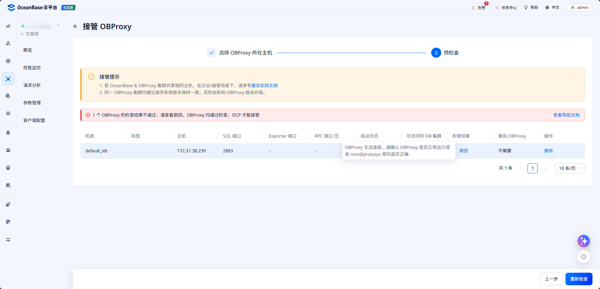 通过obclient 以及 ocp 凭据校验 功能. proxysys 的密码都是可以正常通过的. 但在接管obproxy主机时提示 “OBProxy 无法连接,请确认 OBProxy 是否正常运行或者 root@proxysys 密码是否正确”