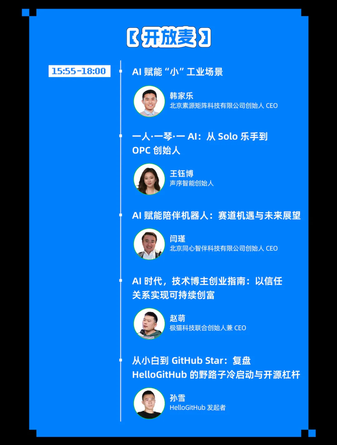 4.“开放麦”闪电分享:来自 OPC 第一线的创业者,将现场揭开他们的运营逻辑与盈利模型,他们会告诉你,一个人如何让 AI 成为营收引擎,从「一个人如何跑通 AI 产品闭环」,到「如何让智能体成为公司合伙人」。